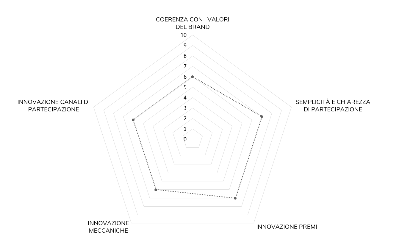 Si tratta di una visualizzazione grafica dei risultati della survey ottenuti attraverso le valutazioni di consumatori attraverso il sito www.promo-like.it su questi aspetti di ogni concorso: